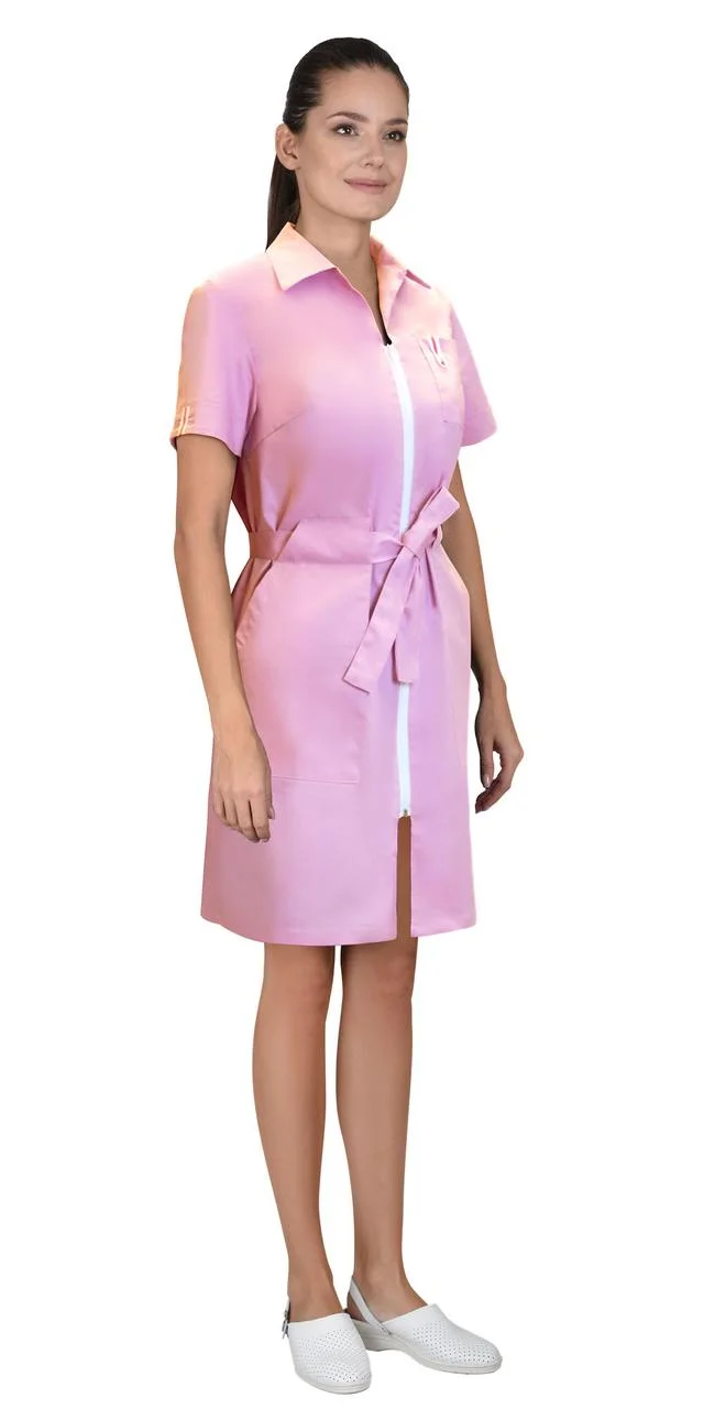 Халат женский полуприлегающего силуэта с центральной застежкой на молнию. Отложной воротник. Нагрудный накладной карман на левой полочке и два нижних накладных фигурных кармана. Рукава втачные короткие. Халат с завязывающимся поясом.