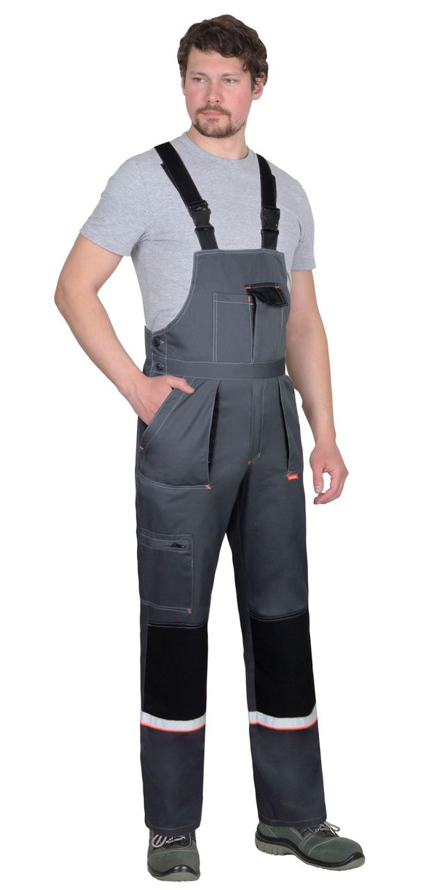 Полукомбинезон прямой, с застежкой спереди на молнию – гульфик и в правом боковом шве на пуговицы, с нагрудными, передними, задними карманами и карманом на правом боковым шве с молнией, с наколенниками, спинка с частичной стяжкой по талии, бретели регулируются при помощи застежек-фастексов и резинки. В полукомбинезоне предусмотрена лента светоотражающая для обозначения сигнальной видимости.