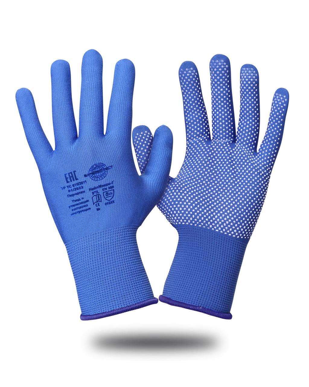 Перчатки из 100% нейлона 13-го класса вязки с микроточкой ПВХ. Цвет: голубой, белая точка, отличная тактильная чувствительность отличная воздухопроницаемость, противоскользящее покрытие с повышенной стойкостью к истиранию широкий диапазон применения.
